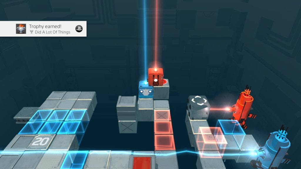 In terms of general movement, each analogue stick on the controller physically moves each robot about. Communication between both player is very important because some of the finer robot controls are split between the directional pad and the four face buttons. The d-pad controls the tilt of the robot that is currently moving. Tilting is useful for manipulating free-moving blocks that can block the pathways of hazards. The other functions mapped to the face buttons allow the currently moving bot to duck down, beep and bleep. The latter two are assumed to be used for communication, but you may find yourself just using them just for laughs. However, being able to duck down can make it possible to place objects on top the robot so that it can easily transport them about. The diabolical nature of the levels mixed with two player having to wrestle over the controls makes for some crazy gameplay and some funny serendipitous moments. It’s equally chaotic to control both robots as one player, as it requires a variety of hand-eye coordination not seen in most games of today. Whether you are playing by yourself or with a friend, Death Squared’s gameplay is intuitive and solid. Including the story levels and the extra party challenges, there is quite a bit here for the asking price. There is definitely some replay-ability here for those who meet with friend on a regular basis to play games.
