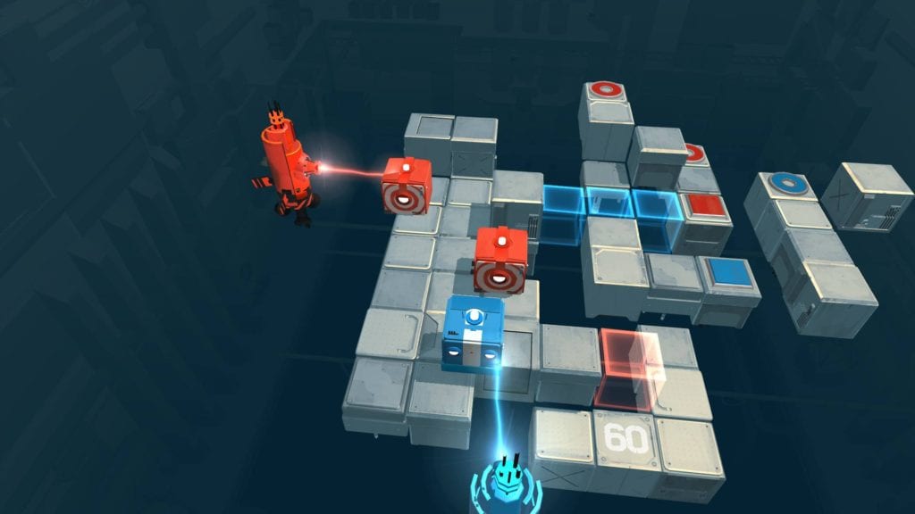 Death Squared’s gameplay centers itself around solving spacial relation puzzles. Each level requires the players to navigate both or all robots toward the exit pads which have to match the color of said robots. All of these ‘testing areas’ have switches that move around aspects of them. They are also armed to the teeth with all sorts of pitfalls and hazards designed to blow up these cute little cube-shaped bots. Things like laser cannons and spikes spell instant death, but the level resets in a matter of seconds. The goal of the game is essentially to complete these areas as quickly as possible with the least amount of bot deaths. These stages are formed completely out of cubes of different types that have their own own unique properties.
