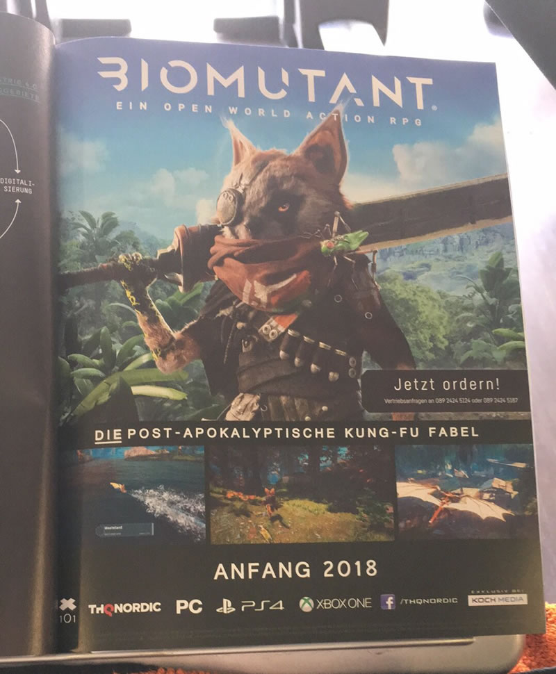 It was accidentally revealed early in a recent German GamesMarkt magazine, an ad for a THQ Nordic-developed Open-World Action-RPG called Biomutant, coming Early 2018 for PS4/X1/PC. The game is being developed by Experiment 101.